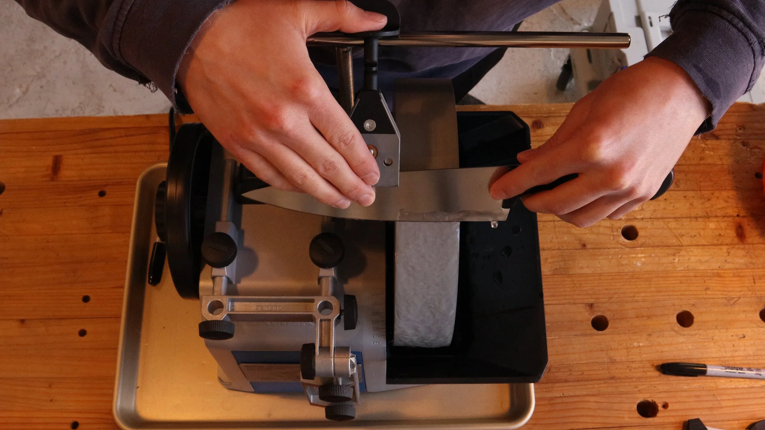 We primarily sharpen on the Tormek T8 Water cooled grinder. The relatively slow speed of 90rpm does not heat the steel and removes minimal material . The water also captures the fine metal particles making it very safe ; no respirator or hearing protection is required. The Tormek uses a clamp and guide rod to help keep the knife at a consistant angle or “Fixed Angle” which is important to achieve maximum sharpness. The Tormek is safe, effective , and versatile so we find it the most enjoyable way to sharpen. There is a larger learning curve with this system so we don’t recommend it for home use. Tormek does have smaller more user friendly models that we do recommend like the T1.
